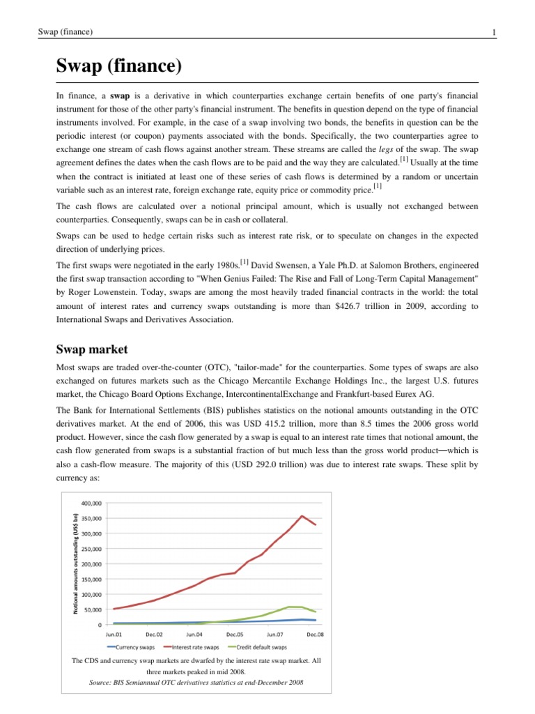 Swaps are not exchange oriented and are traded over the counter, usually the dealing are oriented through banks. Swap the exchange of two securities, interest rates, or currencies for the mutual benefit of the exchangers. An interest rate swap is a financial derivative instrument in which two parties agree to exchange interest rate cash flows. The variety of swap contracts in the marketplace are only limited by the imagination of financial engineers. Gas station owners wouldn't be able to order new tanks to refill the ones that go dry. E a swap, in finance, is an agreement between two counterparties to exchange financial instruments or cashflows or payments for a certain time. Swaps can be used to hedge risk of. Though significantly higher than the originally proposed $100 million threshold, this definition still covers the major financial institutions engaging in swap activity in the us. 83 fr 56666 // pdf version 11/13/2018 17 cfr part 1 Most swaps involve cash flows based on a notional. Individual a offers potatoes to individual b in exchange for a bicycle. Ce sont des produits dérivés, car il n'y a pas d'actif adossé à ce swap. One commenter also argued that regulating financial guaranty of swaps as swaps would cause monoline insurers to withdraw from the market, which could adversely affect the u.s.
